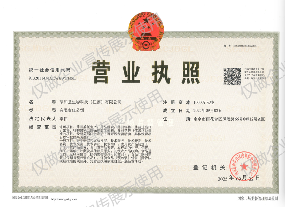 2025年9月2日,萃和堂生物科技(江蘇)有限公司(簡稱“萃和堂”)正式成立,統(tǒng)一社會信用代碼:91320114MAEW6WFN5L,注冊資本金1000萬元。由新立訊科技集團(tuán)股份有限公司、北京金來順投資有限公司與遵義廖元和堂藥業(yè)有限公司按17:2:1聯(lián)合投資設(shè)立?!拜秃吞谩睂⒁劳星嗪J〉蔫坭健⑾x草、鹿茸、黃精等特色農(nóng)產(chǎn)品資源,深度融合中華老字號“廖元和堂”與“中國非遺”發(fā)酵工藝飲片(含片)生產(chǎn)資質(zhì)與成熟技術(shù),從初加工農(nóng)產(chǎn)品到精制加工的中藥飲片(含片)系列大健康消費(fèi)品,助力“青貨出青”鄉(xiāng)村振興戰(zhàn)略。