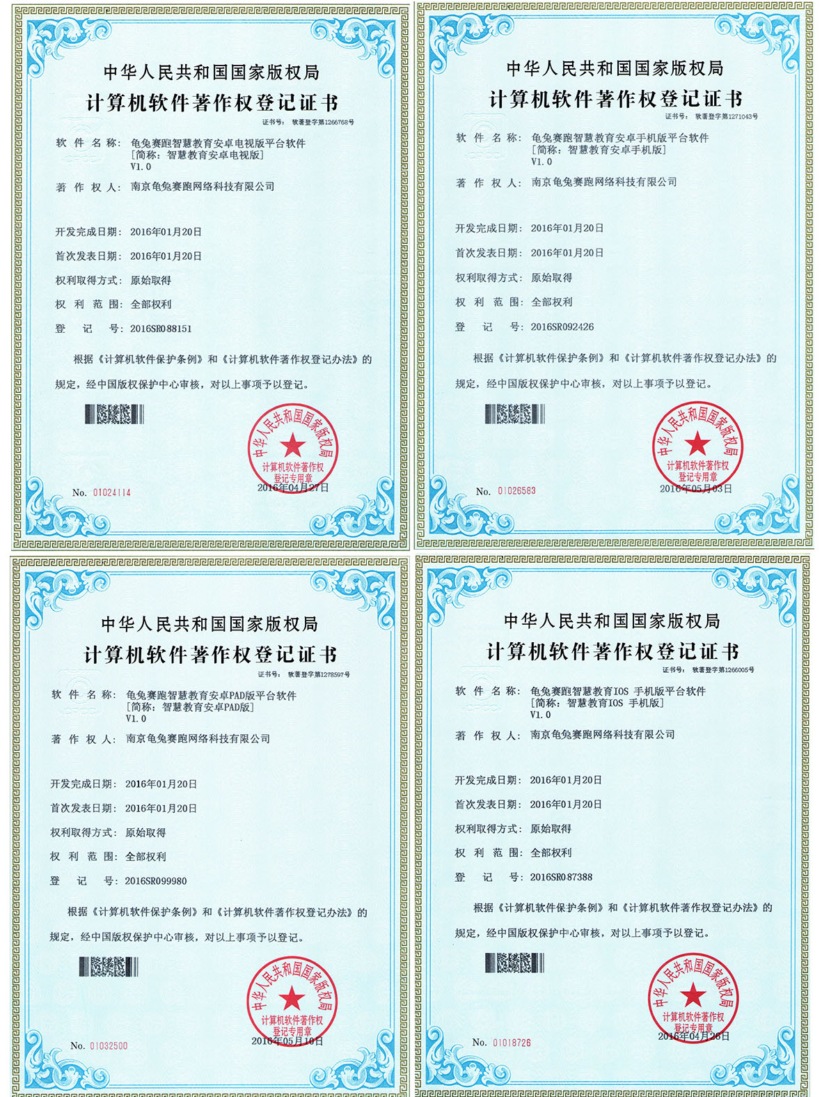 2016年4月27日, 新立訊企業(yè)作為自身?yè)碛泻诵募夹g(shù)、創(chuàng)新能力的國(guó)家高新技術(shù)企業(yè),公司高新技術(shù)研發(fā)中心研發(fā)團(tuán)隊(duì)所研發(fā)的“龜兔賽跑智慧教育IOS手機(jī)版平臺(tái)軟件V1.0”、龜兔賽跑智慧教育安卓手機(jī)版平臺(tái)軟件V1.0”、龜兔賽跑智慧教育安卓PAD版平臺(tái)軟件V1.0”以及“龜兔賽跑智慧教育安卓電視版平臺(tái)軟件V1.0”獲得了由國(guó)家版權(quán)局頒發(fā)的“計(jì)算機(jī)軟件著作權(quán)登記證書(shū)”。至此新立訊企業(yè)擁有發(fā)明專利1項(xiàng),實(shí)用新型專利39項(xiàng),外觀專利7項(xiàng),計(jì)算機(jī)軟件著作權(quán)12項(xiàng),商標(biāo)3項(xiàng)。