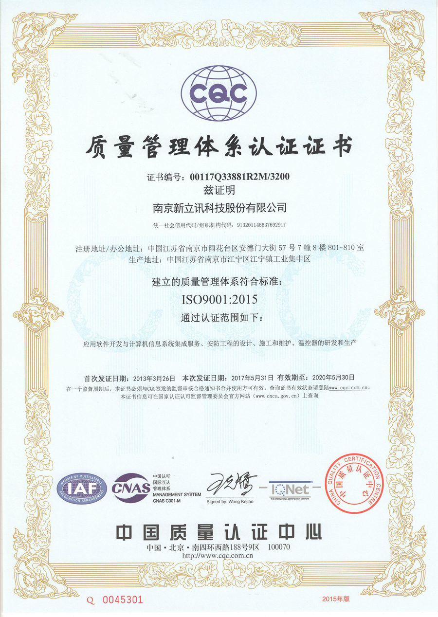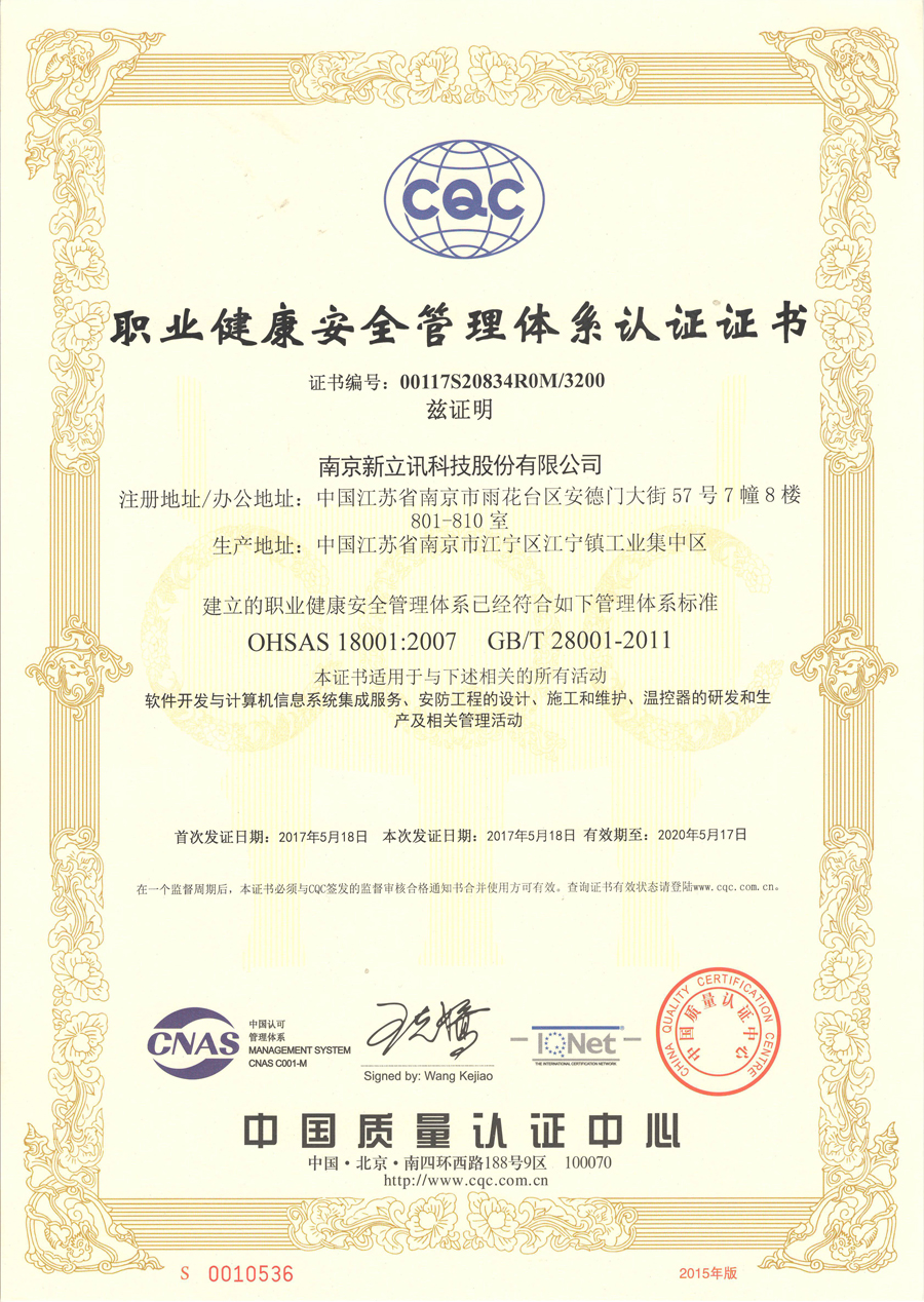 2017年5月,新立訊經(jīng)中國權(quán)威認(rèn)證機(jī)構(gòu)CQC(中國質(zhì)量認(rèn)證中心)全面、嚴(yán)格的評定與審核,正式通過ISO9001國際質(zhì)量管理體系認(rèn)證、ISO14001國際環(huán)境管理體系認(rèn)證、OHSAS18001職業(yè)健康安全管理體系認(rèn)證三大國際管理體系認(rèn)證,并獲得相關(guān)證書。證書涵蓋范圍包括軟件開發(fā)與計(jì)算機(jī)信息系統(tǒng)集成服務(wù),安防工程的設(shè)計(jì)、施工和維護(hù),溫控器的研發(fā)和生產(chǎn)及相關(guān)管理活動。這意味著新立訊成為CNAS(中國合格評定國家認(rèn)可委員會)、IQNet(國際認(rèn)證聯(lián)盟)和IAF(國際認(rèn)可論壇)三方共同認(rèn)可的綜合數(shù)據(jù)應(yīng)用服務(wù)商,更標(biāo)志著新立訊的質(zhì)量管理、環(huán)境管理、健康安全管理等已達(dá)到國際先進(jìn)水平。同時(shí)此三項(xiàng)證書的取得是對新立訊企業(yè)管理理念和質(zhì)量管理水平的充分肯定,也為企業(yè)向社會提供優(yōu)質(zhì)的產(chǎn)品和服務(wù)提供了強(qiáng)有力的保障。