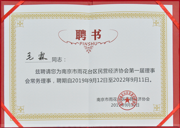 大會通過提名和投票的方式選舉出了會長、副會長、常務(wù)理事單位等,新立訊榮獲“南京市雨花臺區(qū)民營經(jīng)濟協(xié)會副會長單位”,董事長毛霖先生被選舉聘任為第一屆常務(wù)理事、第一屆理事會副會長。