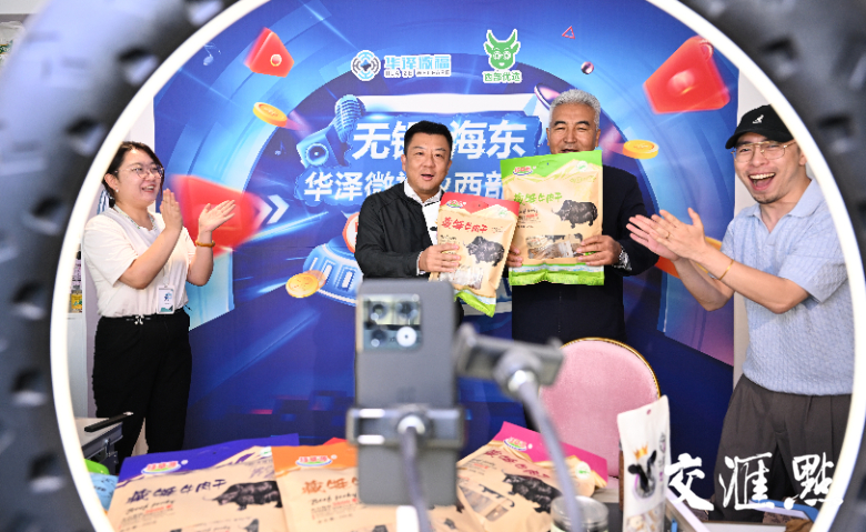 交易中心一樓大廳,分布著4個電商直播間,一端連著消費者,一端連著供應商。在一號直播間,無錫—海東“聯(lián)農(nóng)帶農(nóng)”農(nóng)副產(chǎn)品直播正在進行??吹街鞑ベu力吆喝、氣氛熱烈,省委書記信長星提議:無錫市和海東市的書記,你們也帶帶貨!這一提議得到了兩省領導和代表團成員的一致贊同。