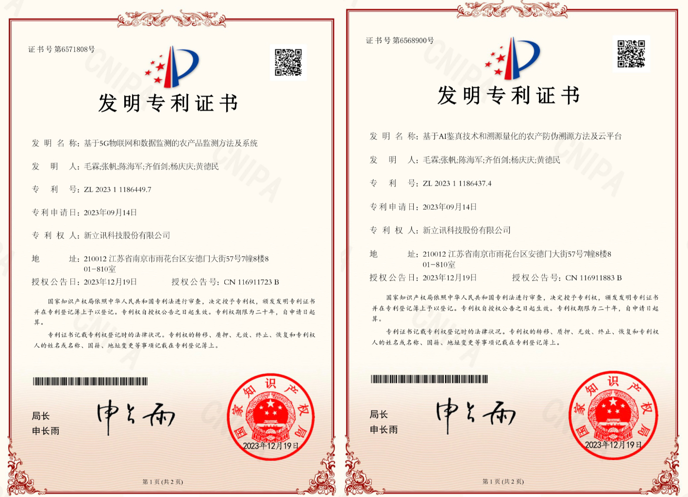 四項發(fā)明專利分別是:基于5G物聯網和數據監(jiān)測的農產品監(jiān)測方法及系統(tǒng)(CN116911723B),基于AI鑒真技術和溯源量化的農產防偽溯源方法及云平臺(CN116911883B),農產品基礎數據資源池管理方法及系統(tǒng)(CN117032906B),一種農產品交易數據處理方法、裝置、服務器及存儲介質(CN117057825B)。四項發(fā)明專利均為原始取得。