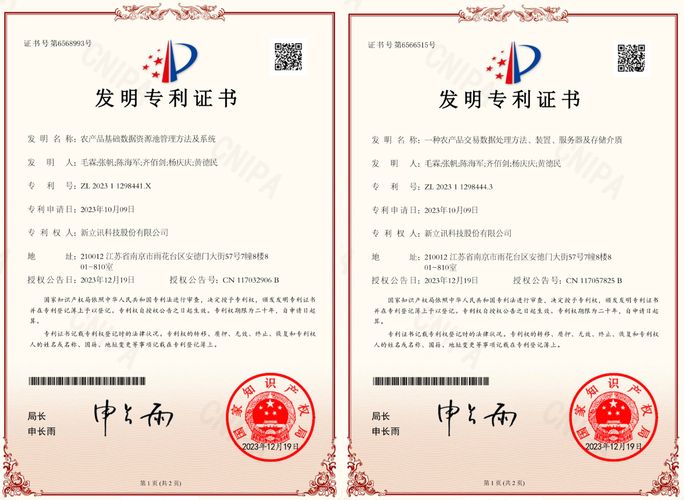 2023年12月,新立訊在農產數據交易領域再獲4項發(fā)明專利。發(fā)明專利涵蓋了農產數據交易與防偽鑒真多個方面,包括數據采集、處理、分析和應用等,將有效提高農產交易數據效率和可持續(xù)性。